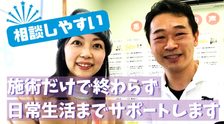 先生の施術は、すごく丁寧で素人でも分かりやすく説明をしてくださいますし、いつも施術前の悪い状態から施術後の良くなった状態を比べさせてくれるので、自分でも実感する事が出来るので、とても嬉しいです。