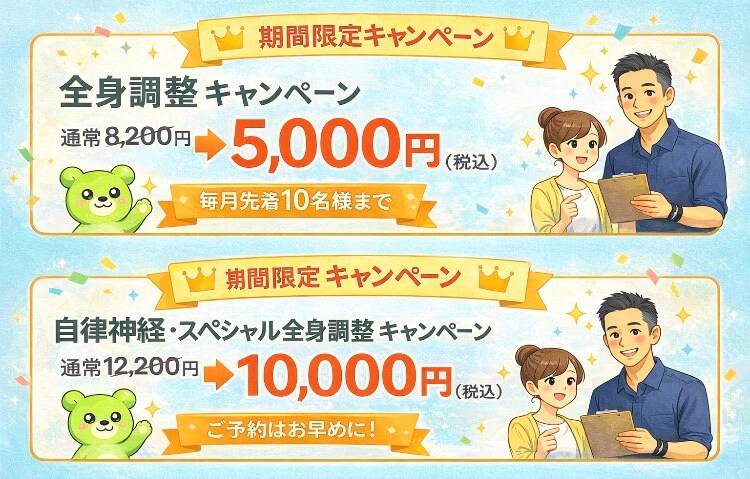 | スペシャル全身調整 (約1時間) | 10,000円 | しっかり整えたい方に |