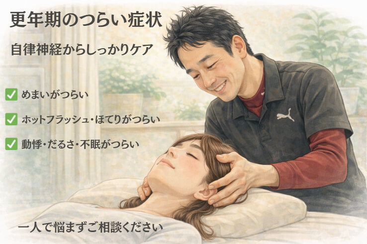 東大阪市のおおくま整骨院では、体の緊張・歪み・呼吸の浅さなどに目を向け、整体で自律神経が働きやすい状態へ整えることで、更年期の不快な症状の軽減をサポートしています。