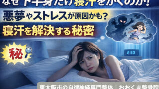 自律神経整体 なぜ下半身だけ寝汗をかくのか!悪夢やストレスが原因かも?寝汗の対策と整え方【東大阪市自律神経専門整体が解説】 下半身だけ寝汗をかく原因は?悪夢や不安、ストレスとの関係をやさしく解説。自律神経の乱れとのつながりや今日からできる対策も紹介します。東大阪市で自律神経にお悩みの方へ。 2026.03.22 自律神経整体